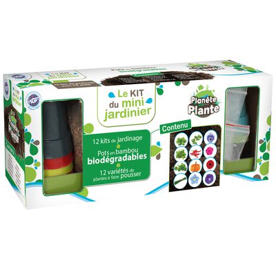 KIT MINI JARDINIER – 12 POTS BAMBOO AVEC GRAINES ET SUBSTRAT (FR)